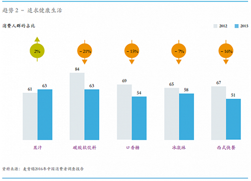 麥肯錫數(shù)據(jù)顯示,碳酸飲料、冰激凌、西式快餐等消費人群占比均有下降,而果汁的消費人群占比則有小幅提升。