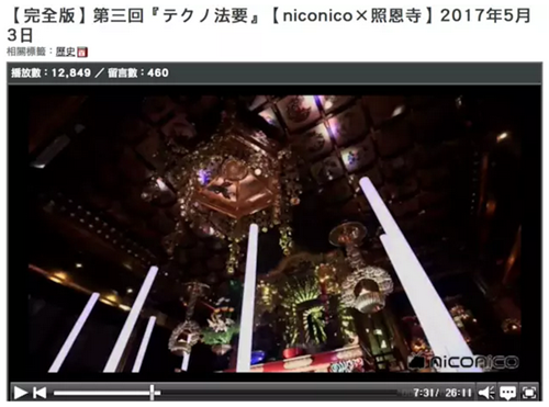 這是日本福井市照恩寺的一場超度儀式,跟以往莊嚴(yán)肅穆的宗教儀式相比,這場電音法會顯得極“不正經(jīng)”。除了用電子音樂誦經(jīng)、3D全息技術(shù)投影、五光十色的照明之外,這場法會還在日本彈幕網(wǎng)站鼻祖 niconico 上進(jìn)行了直播,引來 1.9 萬人觀看。