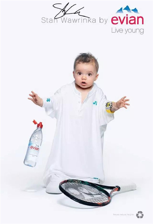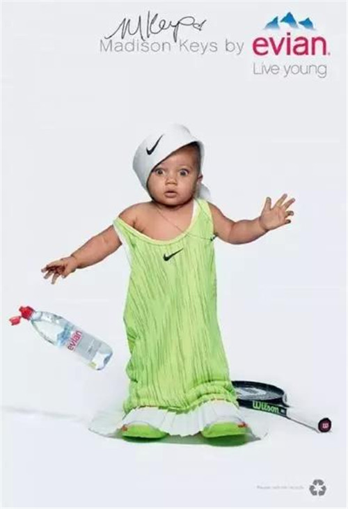 針對(duì)戶外、數(shù)字和社交網(wǎng)絡(luò)的創(chuàng)意則主要集中在一個(gè) Evian Young Team 的概念,一個(gè)由依云代言人莎拉波娃、Stan Wawrinka、Lucas Pouille、Madison Keys 以及高爾夫球員 Lydia Ko 等人組成的團(tuán)隊(duì)來(lái)拍攝廣告的主要視覺(jué):喝了依云水之后,他們都換上一套 Oversize 的運(yùn)動(dòng)服,“變成了嬰兒”。