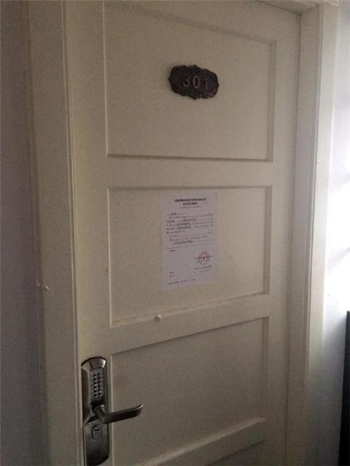 長樂路764弄19號(hào)樓3樓,裝著密碼門的就是這間民宿。2樓業(yè)主反復(fù)投訴后,城管部門上門檢查時(shí)發(fā)現(xiàn)民宿侵占了一部分過道的空間,故城管向業(yè)主下發(fā)了責(zé)令改正通知書。圖中貼于門上的,即是城管下發(fā)的通知書。