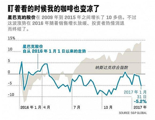 就連舒爾茨本人也說(shuō),星巴克的股票走勢(shì)有些不穩(wěn)。從2009年起到2015年,公司的股價(jià)增長(zhǎng)了1,170%,而在2016年則跌去了8%,這是自從2008年以來(lái)的首次下跌—盡管大盤(pán)上漲了10%。令人沮喪的是,下跌竟然找不到很明確的原因。有些懷疑指向了銷(xiāo)售增長(zhǎng)放緩、舒爾茨(第二次)宣布從首席執(zhí)行官的位置上退休后領(lǐng)導(dǎo)層的不確定性、甚或是這家總部位于西雅圖的公司制定了依靠海外市場(chǎng)的發(fā)展計(jì)劃,而特朗普?qǐng)?zhí)政后給跨國(guó)經(jīng)營(yíng)帶來(lái)了不確定因素。