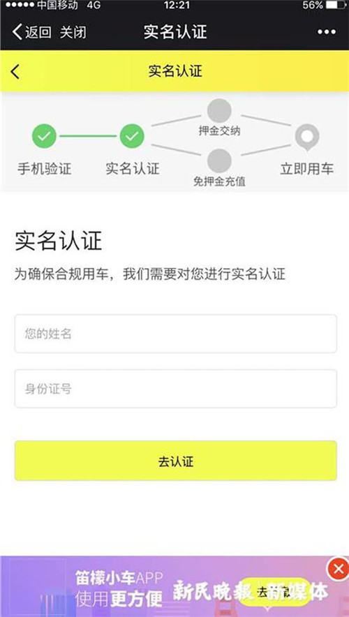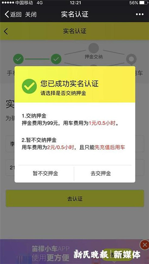 這輛黃色小車車身上貼有二維碼,并寫(xiě)著“掃碼一元用車”,右側(cè)后輪安裝有四位密碼鎖。小新嘗試掃碼,跟共享單車注冊(cè)流程相似,需要手機(jī)注冊(cè)和實(shí)名認(rèn)證。實(shí)名認(rèn)證后,則可選擇是否交納押金,按提示說(shuō)明,兩者在后續(xù)使用費(fèi)用上存在差異,交納99元押金后的使用價(jià)格便宜一些,半小時(shí)1元。