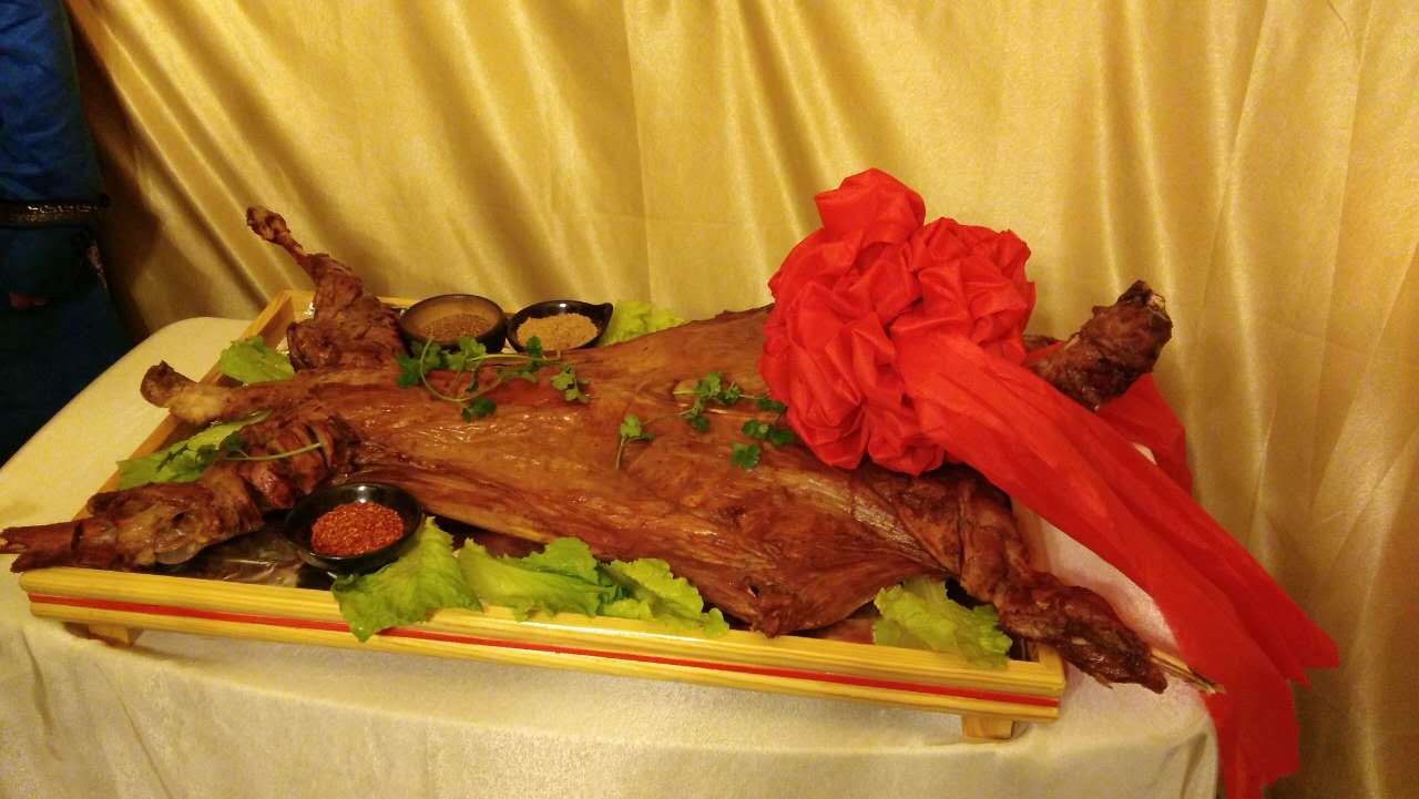 只一道烤全羊,酒店大廚都頗費(fèi)工夫。食材精選肉質(zhì)鮮嫩的鮮羊,肉質(zhì)均勻。因?yàn)閷Α霸丁钡臉O致追求,整只羊需提前三個小時炭火慢慢烤制??救蛏舷螅珴山瘘S,表皮脆嫩,鮮香襲人,令人垂涎欲滴。此時,酒店工作人員會為當(dāng)晚最尊貴的客人獻(xiàn)上哈達(dá),并邀請客人一起舉行“開羊儀式”,在蒙古,這象征主人對朋友最誠摯的祝福。