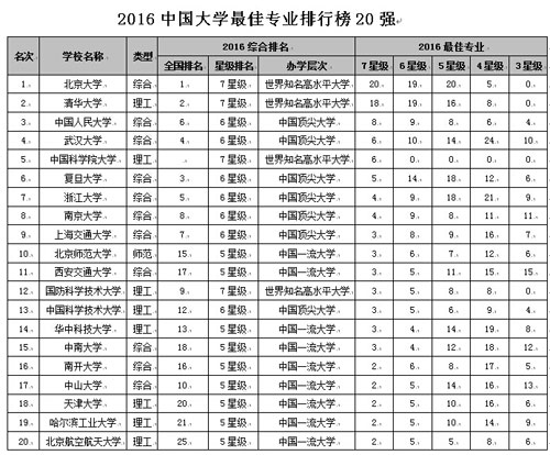 報(bào)告顯示,北京大學(xué)20個(gè)專業(yè)榮膺中國(guó)七星級(jí)專業(yè),居2016中國(guó)大學(xué)最佳專業(yè)排行榜榜首;清華大學(xué)第2,中國(guó)人民大學(xué)第3,武漢大學(xué)第4,中國(guó)科學(xué)院大學(xué)第5。