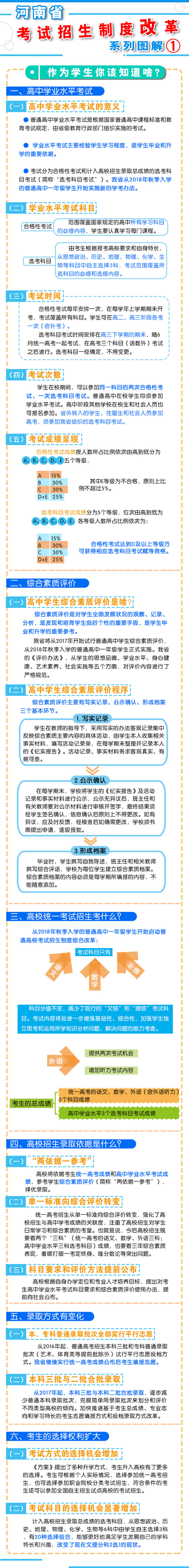 五、2018年秋季開始實施 從2018年秋季入學的普通高中一年級學生開始啟動普通高??荚囌猩贫染C合改革?! ≡诟母锟荚嚳颇吭O置上,不分文理科,外語科目提供兩次考試機會??忌目偝煽冇山y(tǒng)一高考的語文、數(shù)學、外語(含外語聽力)3個科目成績和高中學業(yè)水平3個選考科目考試成績組成。保持統(tǒng)一高考的語文、數(shù)學、外語分值不變?! ≡诟母镎猩浫C制上,推進基于統(tǒng)一高考成績和高中學業(yè)水平考試成績、參考學生綜合素質評價的多元錄取機制改革。高校要根據(jù)自身辦學定位和專業(yè)人才培養(yǎng)目標,提出對考生高中學業(yè)水平考試科目要求和綜合素質評價使用辦法,提前向社會公布?! ?016年省教育行政部門出臺普通高中學業(yè)水平考試實施辦法和普通高中學生綜合素質評價實施辦法,從2018年秋季入學的普通高中一年級學生開始正式實施?! ?strong>省教育廳文件通知: 1、關于印發(fā)《河南省普通高中學業(yè)水平考試實施辦法(試行)》的通知 2、關于印發(fā)《河南省普通高中學生綜合素質評價實施辦法(試行)》的通知