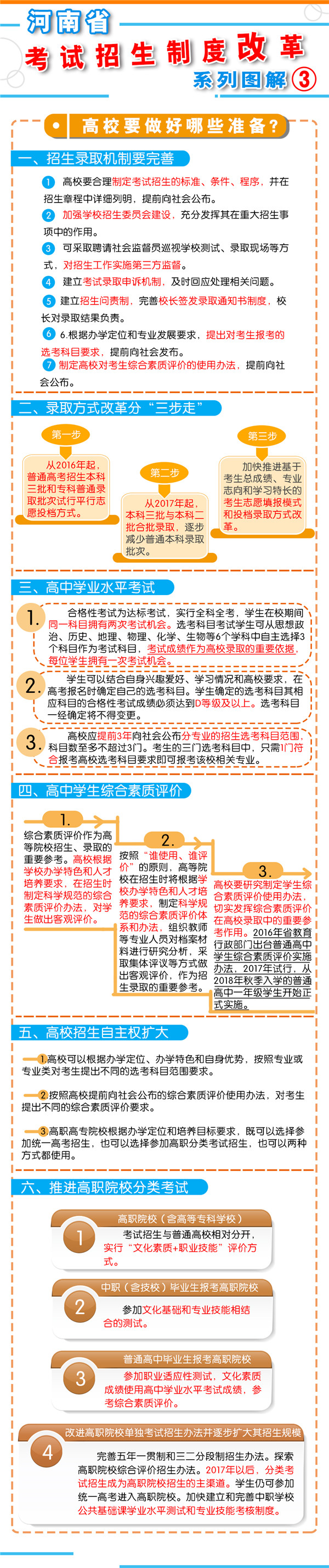 一、促進升學機會公平 逐步增加我省考生接受優(yōu)質高等教育的機會,逐步增加農(nóng)村學生升入重點高校人數(shù),減少和規(guī)范高考加分,完善中小學招生辦法?! ?strong>二、改革考試形式和內容 完善高中學業(yè)水平考試??荚嚪譃楹细裥钥荚嚭陀嬋敫咝U猩浫】偝煽兊倪x考科目考試(簡稱“選考科目考試”)。合格性考試范圍覆蓋國家規(guī)定的高中所有學習科目的必修內容。選考科目由考生根據(jù)報考高校要求和自身特長,從思想政治、歷史、地理、物理、化學、生物等科目中自主選擇3科。學生在校期間,可以參加同一科目的兩次合格性考試、一次選考科目考試?! ∵M一步規(guī)范高中學生綜合素質評價。建立全省規(guī)范統(tǒng)一的高中學生綜合素質檔案,完善學生綜合素質評價電子化管理平臺,客觀記錄學生成長過程中的真實表現(xiàn),確保程序嚴格、公開透明、內容真實可信。 推進高職院校分類考試。高職院校(含高等??茖W校)考試招生與普通高校相對分開,實行“文化素質+職業(yè)技能”評價方式。中職(含技校)畢業(yè)生報考高職院校,參加文化基礎和專業(yè)技能相結合的測試。普通高中畢業(yè)生報考高職院校,參加職業(yè)適應性測試,文化素質成績使用高中學業(yè)水平考試成績,參考綜合素質評價?! ∩罨荚噧热莞母?。依據(jù)國家高中課程標準和高校人才選拔、培養(yǎng)要求,科學設計命題內容,增強基礎性、綜合性,突出能力、創(chuàng)新導向,著重考察學生獨立思考和運用所學知識分析問題、解決問題的能力。