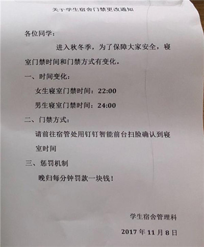 近日,有杭州某高校學(xué)生爆料,杭州某大學(xué)宿舍管理處為管理學(xué)生寢室門禁,引入人臉識(shí)別簽到,要求女生在晚上10點(diǎn)前回宿舍,晚到一分鐘罰款1塊錢,而男生竟然可以晚兩小時(shí)。