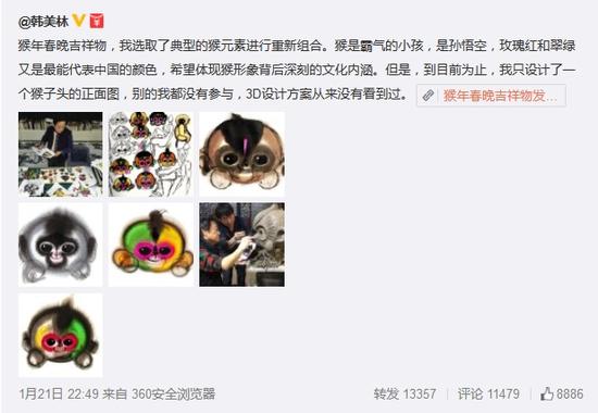 春晚吉祥物康康由“福娃”的創(chuàng)作者之一韓美林設(shè)計(jì),官方稱是以中國傳統(tǒng)水墨畫的藝術(shù)形式,生動(dòng)表現(xiàn)出“猴”的機(jī)靈活潑特點(diǎn)??纯错n老師的手稿,也是能get到喜慶的氛圍和毛茸茸的手感,還算是只討人喜愛的猴子↓