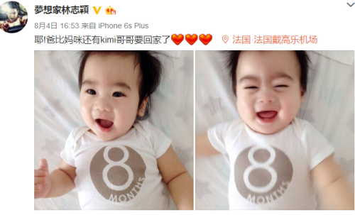 林志穎的長子Kimi已經(jīng)6歲,雙胞胎兒子則是2015年12月才生下來,他4日在社交網(wǎng)站曬出雙胞胎兒子的照片,用童稚的語氣寫道“耶!爸比媽咪還有kimi哥哥要回家了,好想你們喔”,照片中可以看到2個(gè)兒子穿著印有8個(gè)月的寶寶衣,似乎在暗示雙胞胎又長大1個(gè)月了。