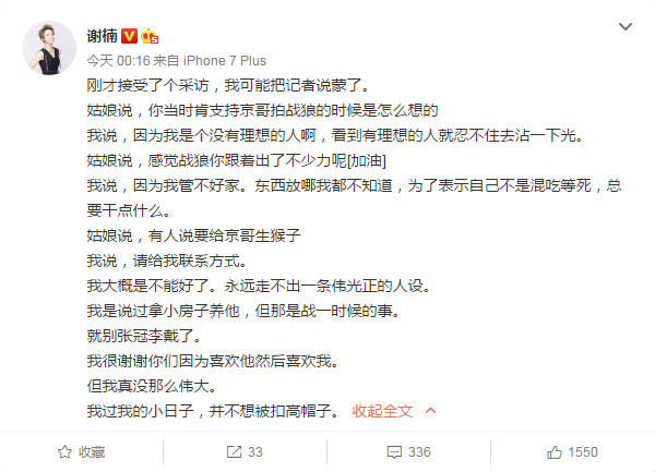 鳳凰網(wǎng)娛樂訊 《戰(zhàn)狼2》自上映以來好評(píng)不斷,票房接連刷新紀(jì)錄,截止8月1日晚票房已經(jīng)達(dá)到15.51億。 由于《戰(zhàn)狼2》的成功,網(wǎng)絡(luò)上出現(xiàn)了很多張冠李戴的文章,把拍《戰(zhàn)狼》時(shí)謝楠說的話硬生生的搬到了《戰(zhàn)狼2》身上。 8月2日凌晨,謝楠在微博發(fā)文澄清養(yǎng)吳京的言論,那是戰(zhàn)一的事,不想被扣高帽子。