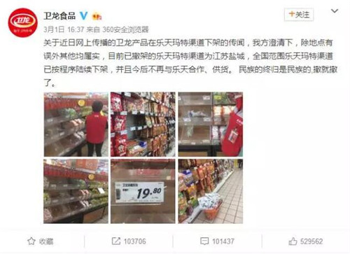 衛(wèi)龍表示,已在全國(guó)范圍從樂(lè)天瑪特渠道下架自家產(chǎn)品,斷絕與樂(lè)天的合作關(guān)系,并稱“民族的終歸是民族的,撤就撤了”。