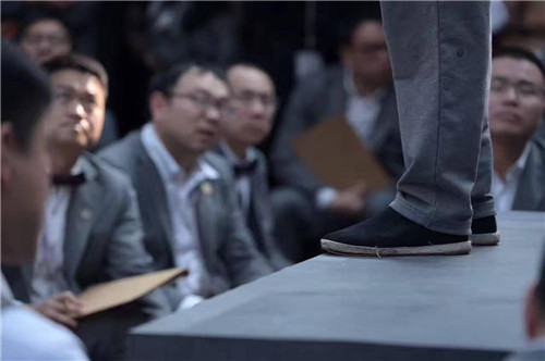 馬校長(zhǎng)遲到了10多分鐘,隨后脫掉了上午穿的西裝外套、皮鞋,身著紅色毛衣、黑布鞋登臺(tái)。