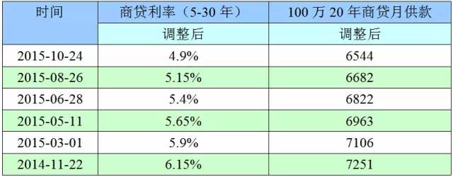 以去年最后的利息調(diào)整日期(2014年11月22日)計(jì)算,你2016年負(fù)擔(dān)的利率一下子從2015年的6.15%下降到4.9%。今年央行利率5連降,100萬(wàn)20年商業(yè)貸款的月供每次約減少150元左右。明年的月供款從7251元下降至6544元,每月節(jié)省707元!