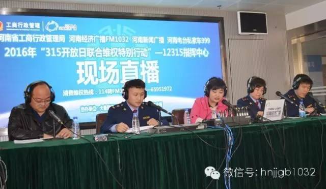 河南經(jīng)濟(jì)廣播在河南省工商局12315消費(fèi)者投訴舉報(bào)中心搭建直播室,河南經(jīng)濟(jì)廣播主持人依明和省工商局12315中心主任宋環(huán)英(右二)、省工商局12315消費(fèi)維權(quán)先鋒隊(duì)隊(duì)長鄭巖(左二)、省工商局企業(yè)信用信息監(jiān)管處副處長萬柳(右一)、河南經(jīng)濟(jì)廣播特約評(píng)論員李剛(左一)在直播現(xiàn)場。