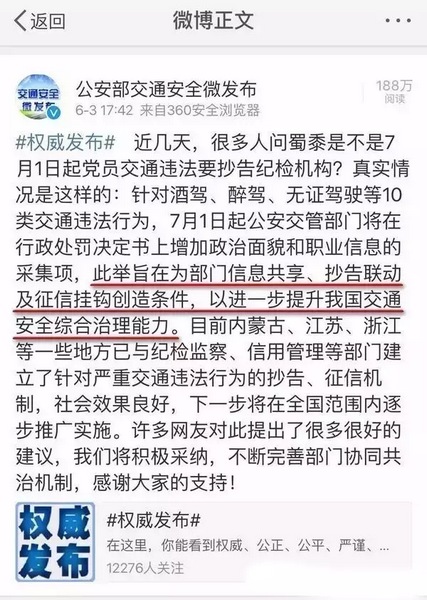 此次調整是公安部按照有關要求及時向紀檢監(jiān)察機關通報涉及中共黨員和國家工作人員實施交通違法行為的一項舉措,目的是為了加強對中共黨員和國家工作人員遵紀守法、做好表率的監(jiān)督和要求。