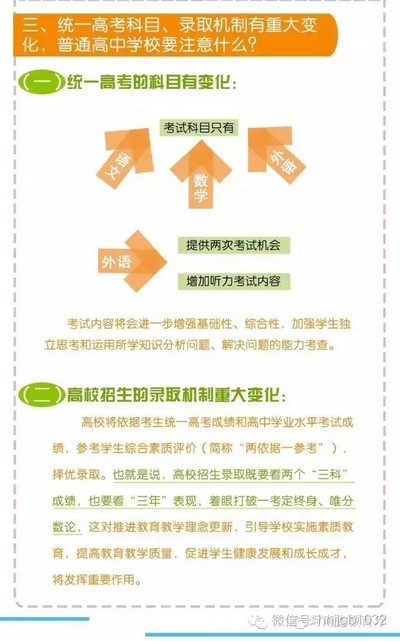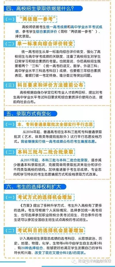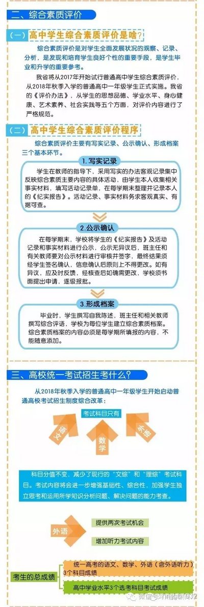 按照《方案》要求,我省從2018年秋季入學(xué)的普通高中一年級學(xué)生開始啟動高考綜合改革,考生總成績由統(tǒng)一高考的語、數(shù)、外3科成績和高中學(xué)業(yè)水平3個(gè)選考科目成績組成。招生錄取實(shí)行基于統(tǒng)一高考成績和高中學(xué)業(yè)水平考試成績、參考學(xué)生綜合素質(zhì)評價(jià)擇優(yōu)錄取機(jī)制。