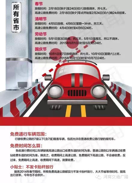 2015年春節(jié)放假安排時(shí)間表已經(jīng)出爐,春節(jié)高速公路免費(fèi)時(shí)間具體從哪天開(kāi)始?持續(xù)多長(zhǎng)時(shí)間?哪些車型可以免費(fèi)通行?