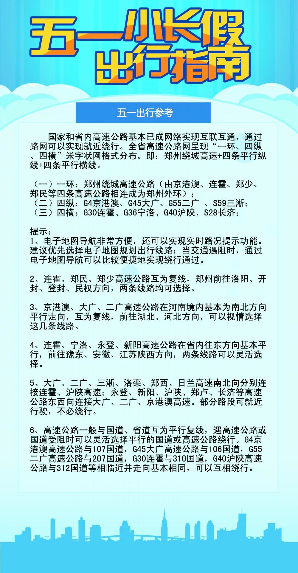 盡量避開假期第一天和最后一天的8時至11時、16時至19時兩個高峰時段,特別是假期最后一天5月3日下午是返程高峰時段。