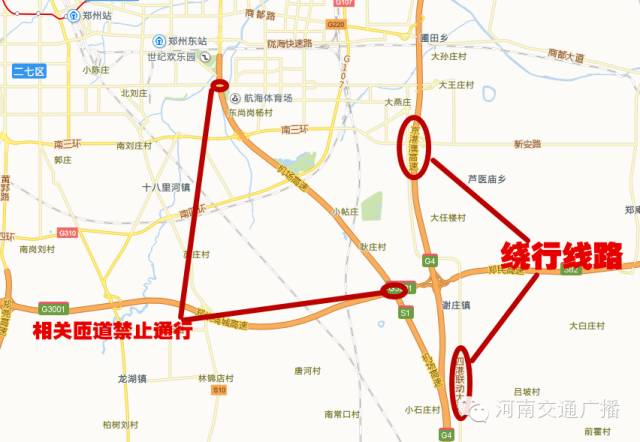 原由鄭州機場高速進(jìn)入鄭州市區(qū)方向車輛繞行京港澳高速公路、四港聯(lián)動大道或其他道路通行。屆時機場高速公路與航海路互通、西南繞城互通、機場互通的相關(guān)匝道將禁止通行。