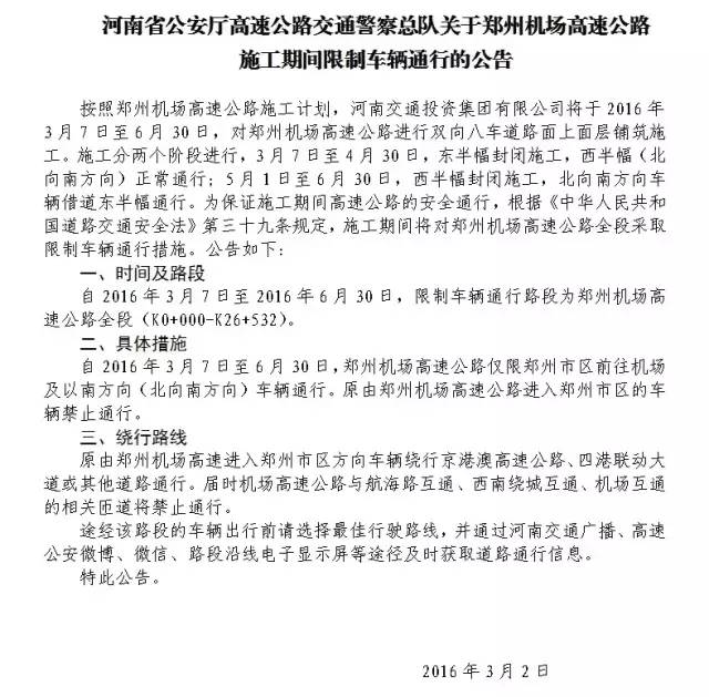施工期間,河南省公安廳高速交警總隊將對鄭州機場高速采取限制車輛通行措施: