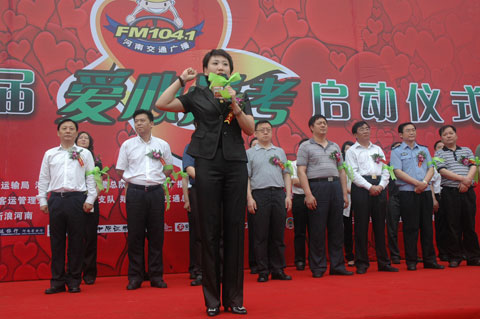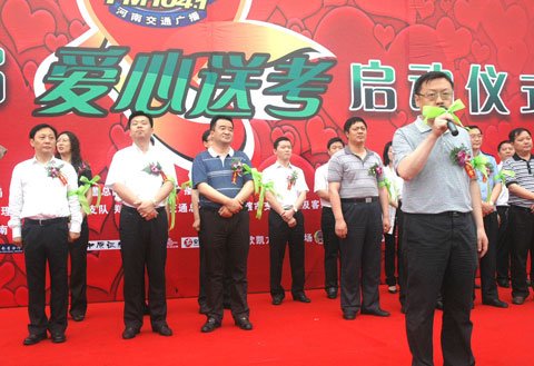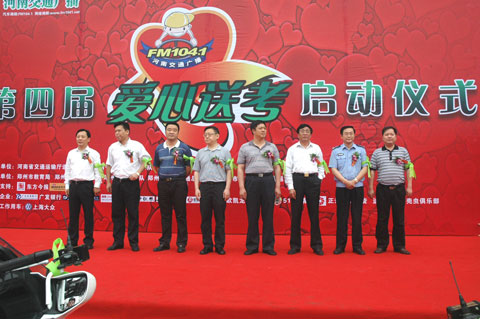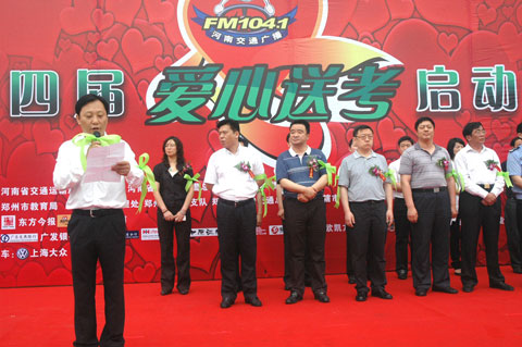 6月4號上午,隨著河南人民廣播電臺總編輯張大寶宣布啟動。河南交通廣播第四屆全省愛心送考大型公益活動正式拉開帷幕。河南省交通運輸廳道路運輸局、河南省公安廳交警總隊、河南人民廣播電臺以及鄭州市教育局、鄭州市交警支隊、鄭州市客運管理處、鄭州市公交總公司等多家單位的領導出席了活動儀式。