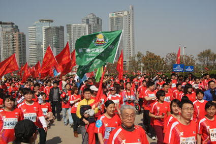 3月27上午,綠城鄭州陽光明媚,春意盎然,2011年中國鄭開國際馬拉松賽分別在鄭州市鄭開大道和鄭東新區(qū)商務(wù)內(nèi)環(huán)鳴槍舉行,來自28個國家和地區(qū)的近3萬名選手參加了比賽。河南交通廣播也組織了由1041名車友組成的“千人跑友團(tuán)”參賽,大家一起跑進(jìn)春天,共同慶祝交通廣播成立18周年。