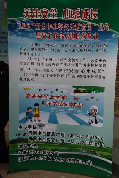 2012年3月26日是第十七個(gè)“全國(guó)中小學(xué)安全教育日”,在教育日當(dāng)天舉行“中小學(xué)安全教育基地”掛牌儀式,河南電臺(tái)信息廣播依托日常欄目《法制新河南》的整合資源,將中小學(xué)安全宣傳教育常態(tài)化。據(jù)河南電臺(tái)信息廣播總監(jiān)李金鋒介紹,“教育基地建立以后,河南電臺(tái)信息廣播將聯(lián)合鄭州市公安局柳林分局,通過(guò)信息廣播AM603、FM105.6廣播頻率,以《法制新河南》欄目為陣地,長(zhǎng)期持久的宣傳中小學(xué)安全教育知識(shí),并為柳林鎮(zhèn)第四小學(xué)的學(xué)生提供書(shū)籍、器械等安全教育的物品,節(jié)目主持人和柳林分局的警官還將不定期的深入校園內(nèi),跟學(xué)生們面對(duì)面的交流、一對(duì)一的輔導(dǎo)?!?br />