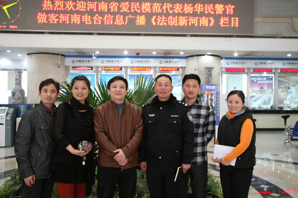 2012年3月16日下午四點(diǎn),中央電視臺攝制組進(jìn)入河南電臺信息廣播《法制新河南》節(jié)目直播間進(jìn)行了拍攝。在節(jié)目中做客的是全國愛民模范鄭州市花園路農(nóng)業(yè)路楊華民交通示范標(biāo)準(zhǔn)崗崗長楊華民。