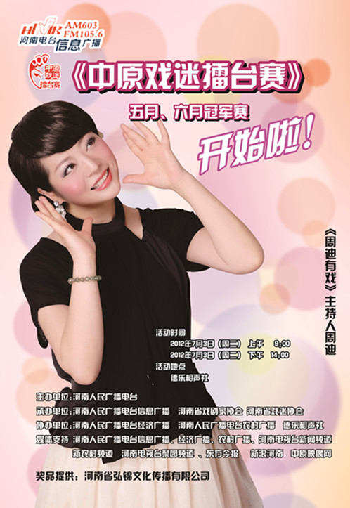 今天(7月3日)09:00-12:00、14:00-17:00,“中原戲迷擂臺賽”五月、六月月冠軍賽將在鄭州德樂相聲社開賽。河南電視臺九頻道12:19(明天07:00)《播報河南》、河南電視臺新聞頻道16:00《中原播報》、明天出版的《東方今報》將對本次比賽進(jìn)行報道。