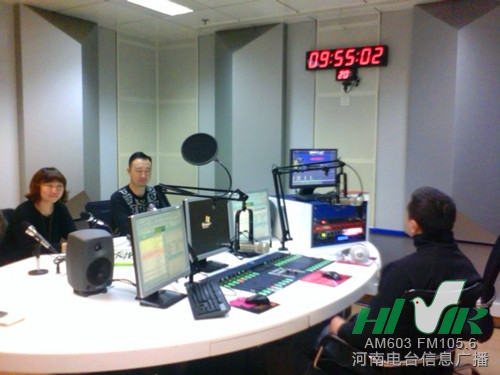 信息廣播主持人和臺技術(shù)人員在直播室