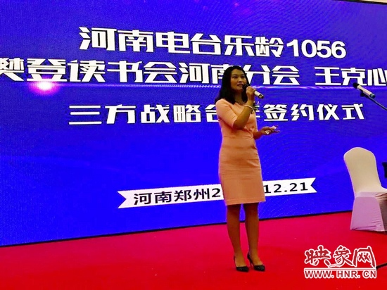 在河南電臺(tái)樂(lè)齡1056“說(shuō)說(shuō)心理話”主持人文聰?shù)闹鞒窒?,河南電臺(tái)信息廣播總監(jiān)助理沈建波、樊登讀書會(huì)河南分會(huì)會(huì)長(zhǎng)程海濤、王克心理創(chuàng)始人王克共同簽約了三方合作協(xié)議。
