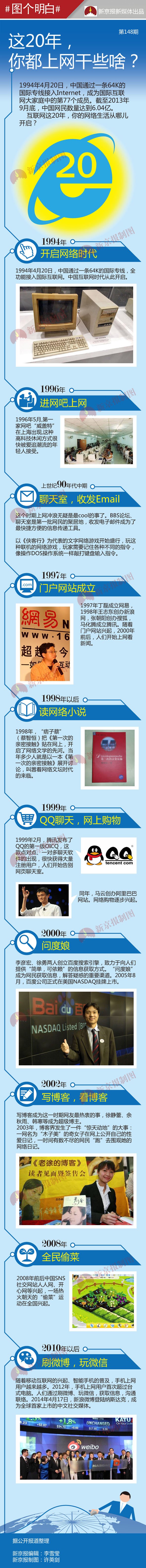 1994年4月20日,中國通過一條64K國際專線接入Internet,成為國際互聯(lián)網(wǎng)大家庭中的第77個(gè)成員。截至2013年9月底,中國網(wǎng)民數(shù)量達(dá)到6.04億?;ヂ?lián)網(wǎng)這20年,你的網(wǎng)絡(luò)生活從哪兒開啟?
