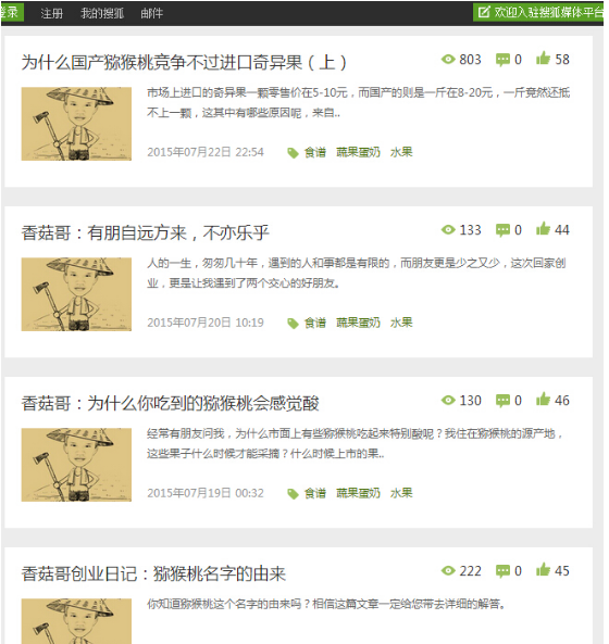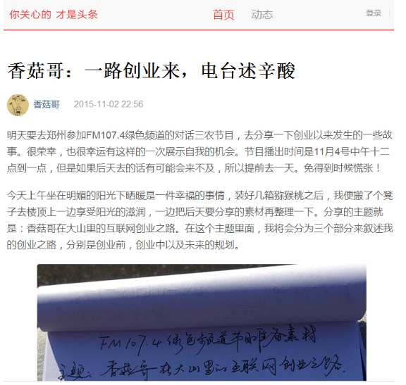 自媒體,以“香菇哥”的名義在各個(gè)自媒體平臺申請入駐,最先申請的是搜狐媒體平臺,運(yùn)作的這幾個(gè)月,搜狐上的累計(jì)閱讀量目前已達(dá)到16萬。后來又申請了今日頭條,一點(diǎn)咨詢,鳳凰新聞媒體平臺等渠道。也建立了自己的微信公眾號。目前所有的宣傳渠道的累計(jì)閱讀量已經(jīng)突破了七十萬。就是在這些渠道上宣傳自己的創(chuàng)業(yè)故事以及大山里面的人文風(fēng)情來傳播。