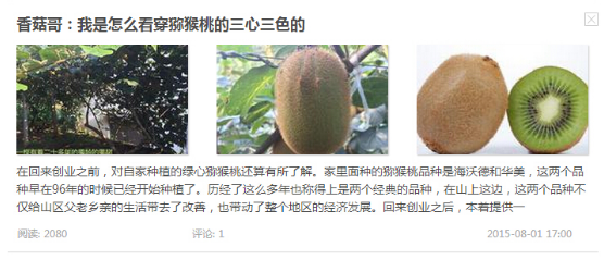 通過這些文章的傳播,我認(rèn)識到了很多的朋友,這些朋友也給我提供了很多的幫助,通過他們我開拓了視野,對獼猴桃有了更加深刻的了解。這些幫助都來自于這些文章的宣傳。雖然有時(shí)候晚上熬夜到凌晨的兩三點(diǎn),但是我覺得正是這份辛苦,讓我更加體會到創(chuàng)業(yè)帶來的精神上的收獲。