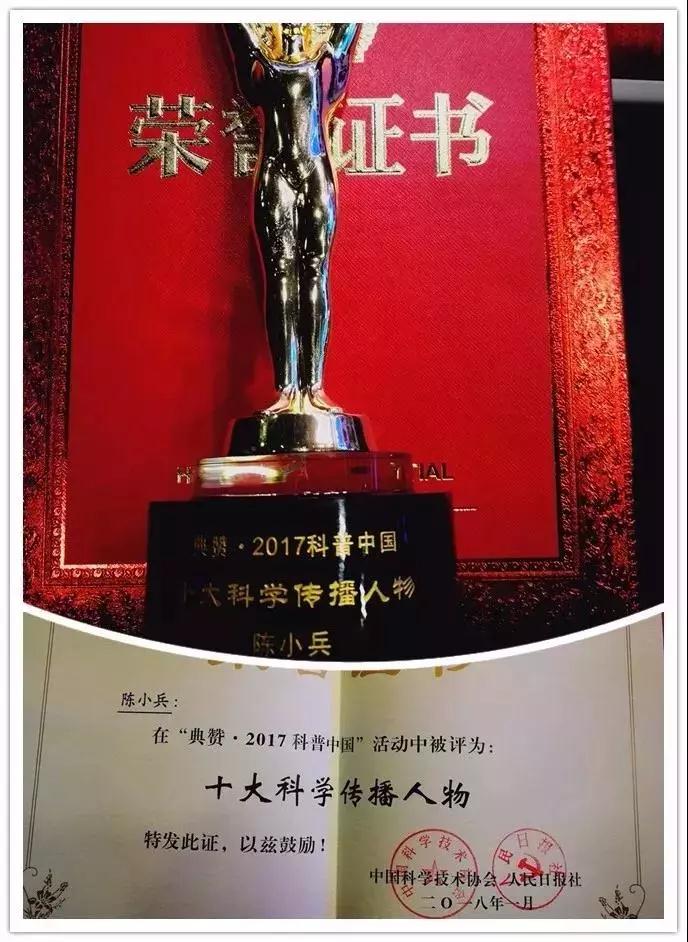 陳小兵當(dāng)選“2017年十大科學(xué)傳播人物”,組委會(huì)給予他的頒獎(jiǎng)詞是,在緊張的臨床工作之余,他熱心醫(yī)學(xué)科普,下基層、走街道、進(jìn)校園、入社區(qū),腳步走遍中原,做科普講座300余場(chǎng),受眾十余萬人,積極推廣“預(yù)防為主”的防癌理念,為腫瘤科普殫精竭慮,被譽(yù)為“中原腫瘤科普第一人”。