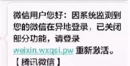 #最新詐騙手法#【收到微信帳號(hào)異地登錄短信時(shí)要警惕!】近期很多人收到這樣的短信:“微信用戶(hù)您好:因系統(tǒng)監(jiān)測(cè)到您的已微信在異地登錄,并已關(guān)閉部分功能,請(qǐng)登錄weixin.wxqsi.pw重新激活?!掘v訊微信】”。廳哥提醒:這其實(shí)是一個(gè)由偽基站發(fā)來(lái)的詐騙短信,一旦打開(kāi)鏈接,很有可能被誘導(dǎo)輸入微信帳號(hào)、微信密碼、支付密碼、驗(yàn)證碼等,后果不堪設(shè)想……