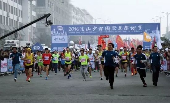 11月13日上午,隨著2016嵩山少林國(guó)際馬拉松賽發(fā)令汽笛鳴響,來(lái)自世界16個(gè)國(guó)家和地區(qū)的近15000名跑友跑出起點(diǎn),瞬間匯聚成流動(dòng)的七彩人潮,為嵩山美景增架起一道絢麗的彩虹。