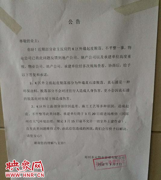 不過,發(fā)稿前,“大象幫辦”記者接到了該小區(qū)物業(yè)的最新消息:為消除業(yè)主的顧慮,他們已在小區(qū)單元門口張貼公告,向業(yè)主解釋了外立面凸起產(chǎn)生原因,并承諾承建單位工程部將組織維修人員在3月20日之前進(jìn)場維修,直至此類問題維修完畢。