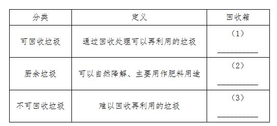 請(qǐng)你根據(jù)生活常識(shí),將以下垃圾填入上表對(duì)應(yīng)的“回收箱”類別中。①?gòu)U燈管 ②瓷磚瓦片 ③香蕉皮 ④剩菜剩飯 ⑤喝過的茶葉 ⑥過期藥品 ⑦廢塑料袋 ⑧廢玻璃