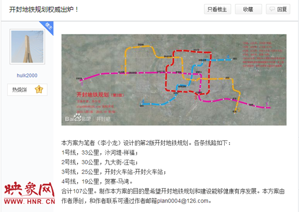 映象網(wǎng)快訊(記者 阮海峰 文/圖)網(wǎng)絡上謠傳“開封要修建地鐵,市區(qū)內(nèi)規(guī)劃了4條線路”近日不少開封市民在網(wǎng)上看到一則關于開封要修建地鐵的消息,引來一片熱議,同時市民在論壇上也有發(fā)帖熱議。11月2日,映象網(wǎng)記者隨即向開封市發(fā)改委求證,得知這一消息目前暫無定論,同時也希望大家不要再傳播.