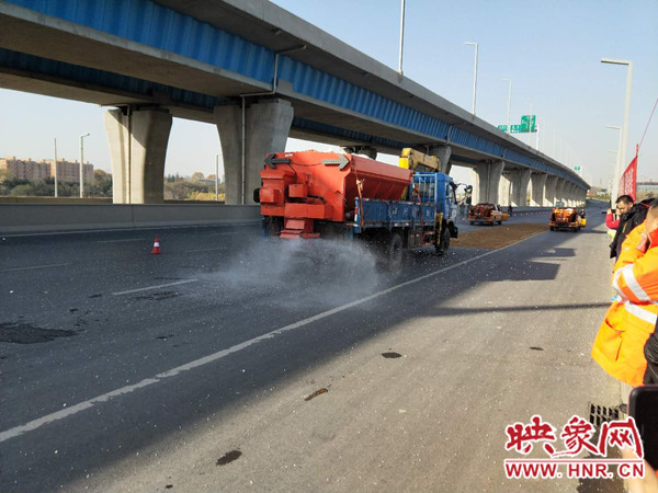 快速路的除雪保潔工作,趙勇總結(jié)為“一融、二鏟、三輥掃、四清運”。一融:氣溫在0度以下撒融雪劑。因為溫度低橋上路面會結(jié)冰,在橋上部分少量食用融雪劑,目的達到不結(jié)冰。二鏟:將不結(jié)冰的雪鏟到兩側(cè)。三輥掃:雪鏟滾刷清掃積雪。四清運:人機配合全面清除殘存冰雪。