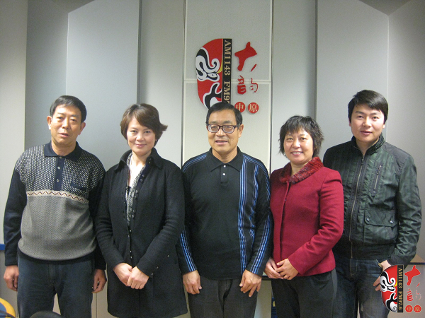 (左起):梓軒藝術(shù)團主任聶衛(wèi)國、副團長兼主要演員李風(fēng)莉、團長李春友、主任魏桂愛和著名戲曲節(jié)目主持人戲曲廣播“當(dāng)家小生”月陽在直播間