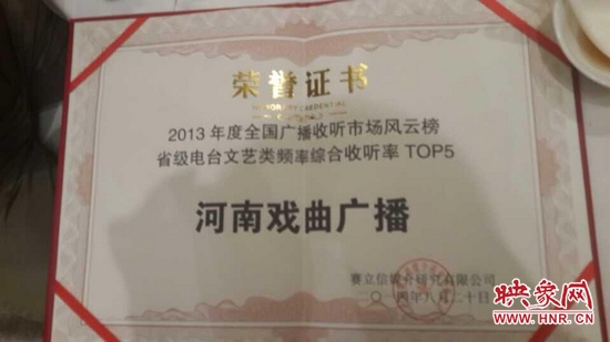 2014年8月20日晚上,國(guó)內(nèi)知名廣播收聽率調(diào)查公司賽立信媒介研究有限公司在成都舉行發(fā)布會(huì),授予河南電臺(tái)戲曲廣播娛樂976“2013年度全國(guó)廣播收聽率TOP5”榮譽(yù)稱號(hào)。