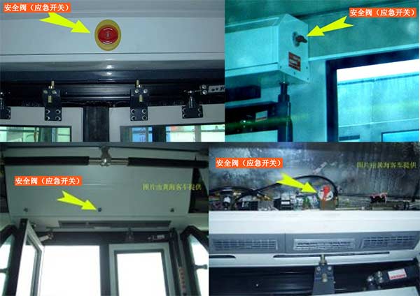 公交車的車門上方配有一個車門開啟安全閥,此安全閥在車輛斷電、斷氣的情況下也可以打開車門。離門近的乘客只要將此安全閥旋轉,然后手動將門打開下車即可。