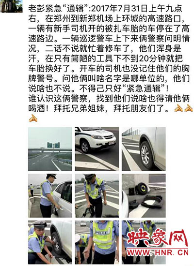 據(jù)介紹,7月31日9時(shí)許,河南省公安廳高速交警總隊(duì)一支隊(duì)執(zhí)勤民警徐玉成、余曉偉巡邏到機(jī)場高速與鄭州西南繞城高速互通處附近時(shí),看到北向南方向一輛白色轎車停在高速路邊,上前一看車輛前輪輪胎爆胎了,司機(jī)急著去開會卻不會修車,急得滿頭大汗卻無從下手,民警了解情況后,二話沒說在酷暑高溫天氣迅速幫司機(jī)把車胎換好,司機(jī)連聲表示感謝,由于當(dāng)時(shí)急著去開會,沒有來得及問出民警姓名,于是就出現(xiàn)了開頭“緊急通緝”的一幕,公司領(lǐng)導(dǎo)和員工也紛紛轉(zhuǎn)發(fā)正能量,“通緝”找人。伸手幫一把,傳遞正能量一大片。