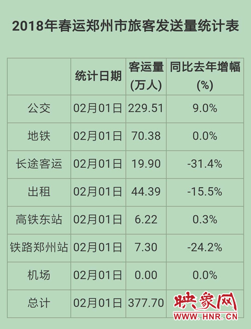據(jù)鄭州市交通委發(fā)布的大數(shù)據(jù)稱,鄭州公交、高鐵站客運(yùn)量比去年同期同比增長(zhǎng);而長(zhǎng)途汽車客運(yùn)、出租車、老火車站客運(yùn)量同比呈現(xiàn)下降趨勢(shì);地鐵客運(yùn)量和去年同期保持持平。