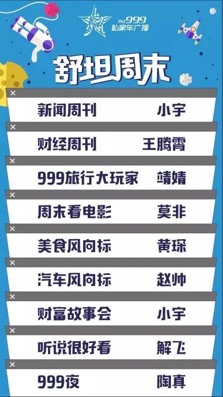 新聞周刊、財(cái)經(jīng)周刊、財(cái)富故事會(huì)、聽說很好看、美食風(fēng)向標(biāo)、汽車風(fēng)向標(biāo)……周末的生活,就得這么舒坦,就得這么輕松有料。短小趣味的節(jié)目,不同屬性的內(nèi)容,你要音樂,還是資訊,我們這里全部都有。