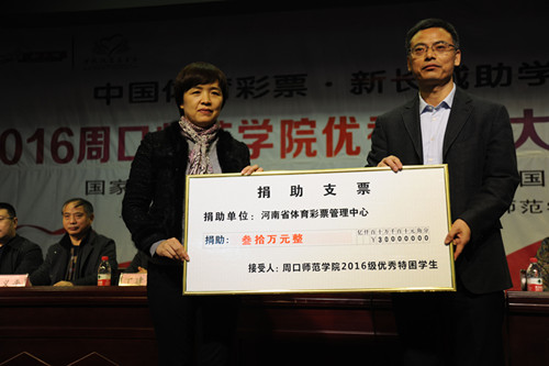 2016年12月7日、8日,中國(guó)體育彩票品牌公益項(xiàng)目“中國(guó)體育彩票新長(zhǎng)城助學(xué)基金”2016年捐贈(zèng)儀式分別在商丘師范學(xué)院和周口師范學(xué)院舉行。據(jù)悉,通過此次捐贈(zèng)活動(dòng),河南省體育彩票管理中心共向兩個(gè)學(xué)校來自全國(guó)14省區(qū)的120名優(yōu)秀貧困大學(xué)生每人捐助5000元,幫助他們和他們的家庭,減輕學(xué)習(xí)生活中的經(jīng)濟(jì)負(fù)擔(dān)。