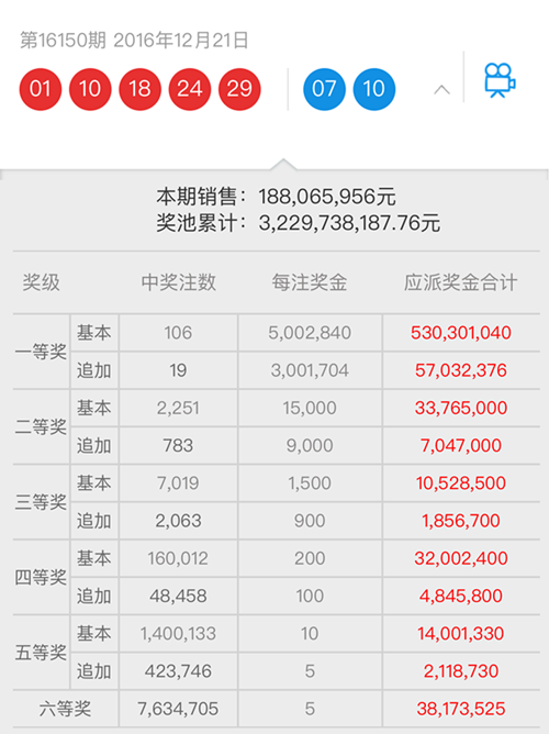 [摘要] 北京時間2016年12月21日晚,體彩大樂透第16150期開獎,開獎號碼前區(qū)為“01、10、18、24、29”,后區(qū)開獎號碼為“07、10”。