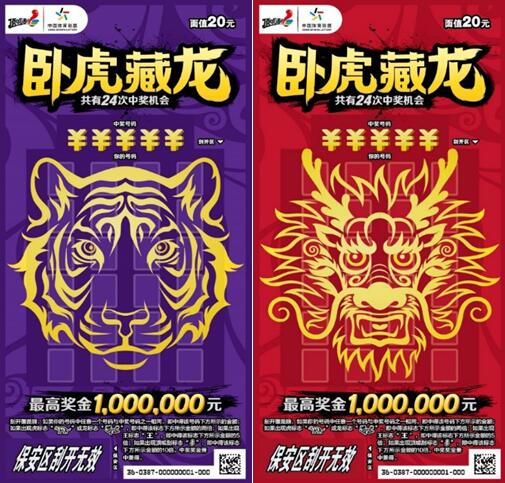 本次上市的“臥虎藏龍”主題即開套票,共有5元、10元、20元三種面值。票面設(shè)計(jì)色彩濃郁、霸氣美觀,“虎頭”、“龍頭”標(biāo)識躍然于票面正中,“眼神”犀利且極富“挑戰(zhàn)”意味,寓意充滿自信,敢于挑戰(zhàn)最高獎金。
